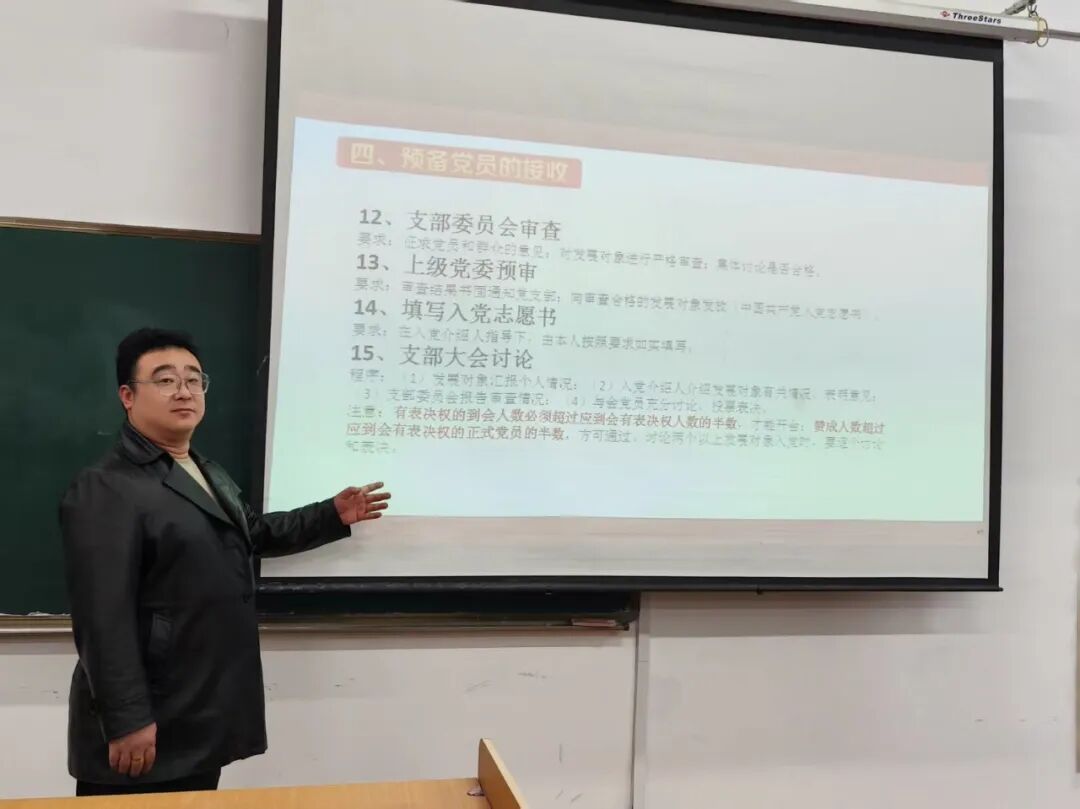 郭梓睿书记围绕党的基本知识、入党条件、入党流程三大维度展开详细解读。在“党的基本知识”板块,他明确中国共产党的历史起点,阐释“为中国人民谋幸福,为中华民族谋复兴”的初心使命,同时深入讲解党的性质、“全心全意为人民服务”的宗旨、党章的根本地位,以及以马克思列宁主义、习近平新时代中国特色社会主义思想等为核心的指导思想。在“入党条件”部分,既强调18岁以上中国公民、承认党的纲领章程等基础要求,也针对学生群体明确学业标准,以及服务同学、发挥模范带头作用的思想行动要求。