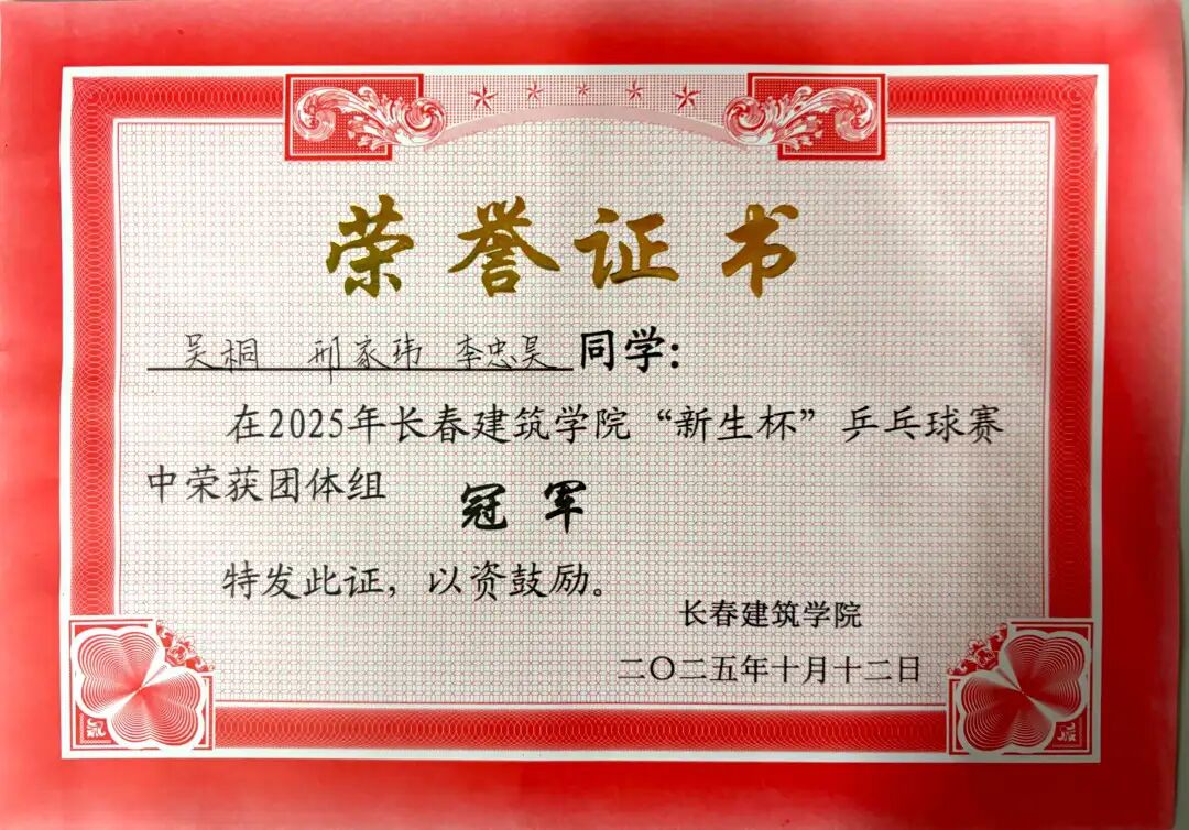 交通学院乒乓球团队成员吴桐、李忠昊、邢家玮三名同学成功斩获2025年长春建筑学院“新生杯”乒乓球赛团体赛冠军。