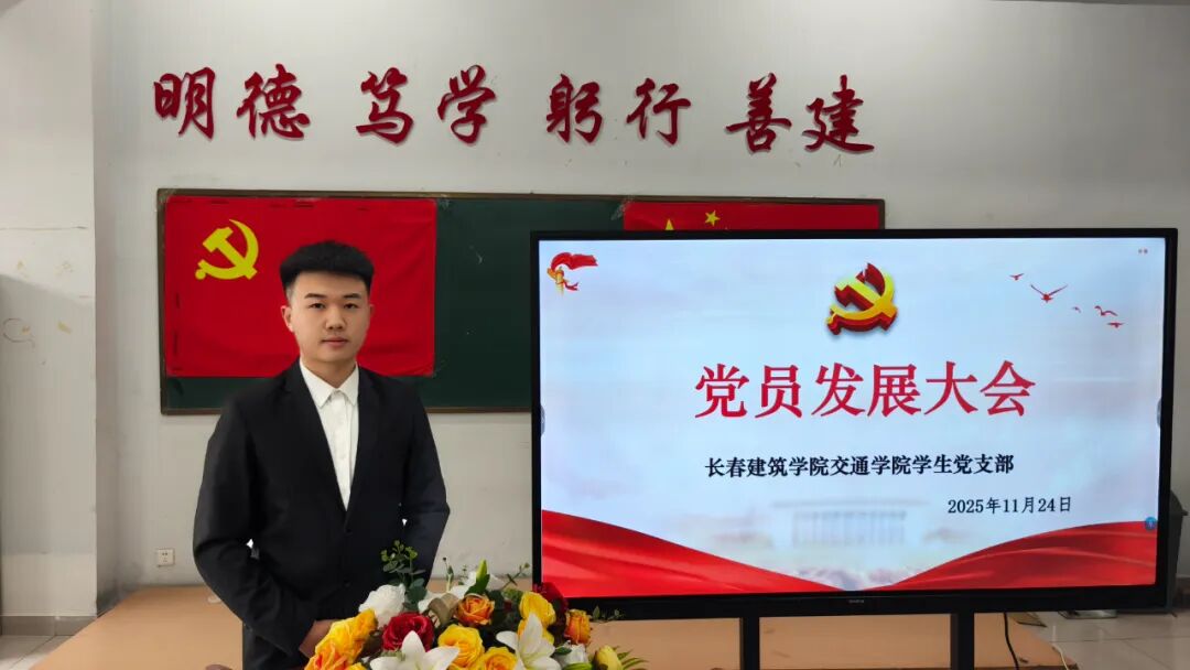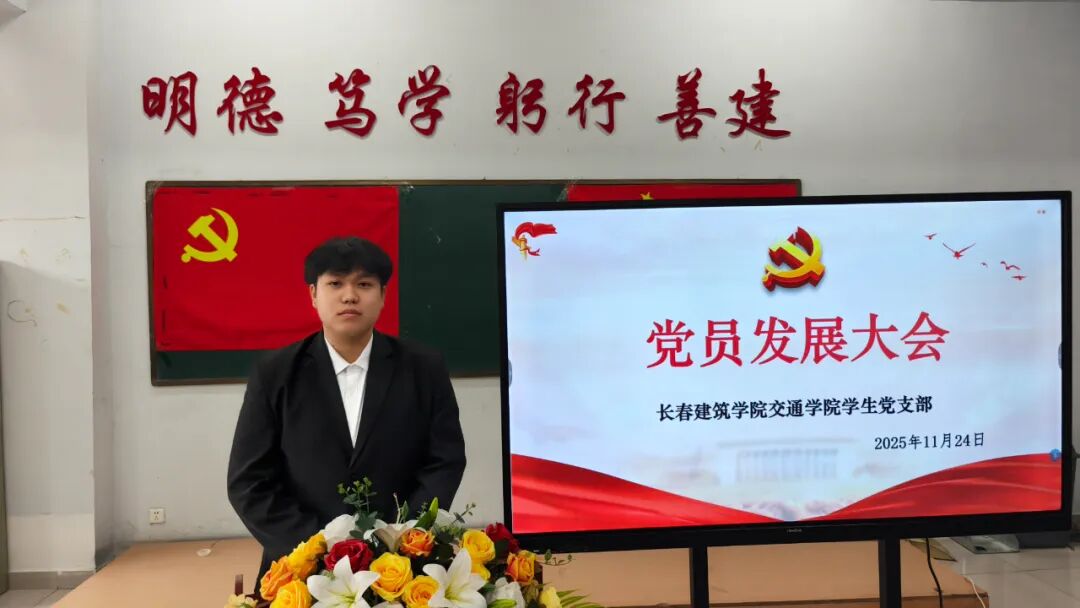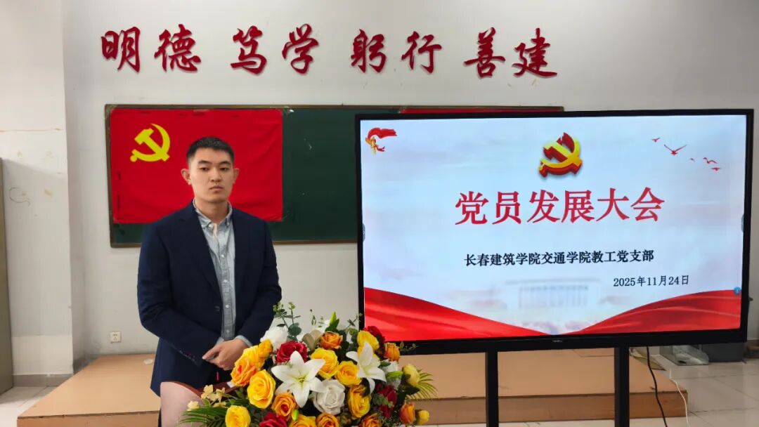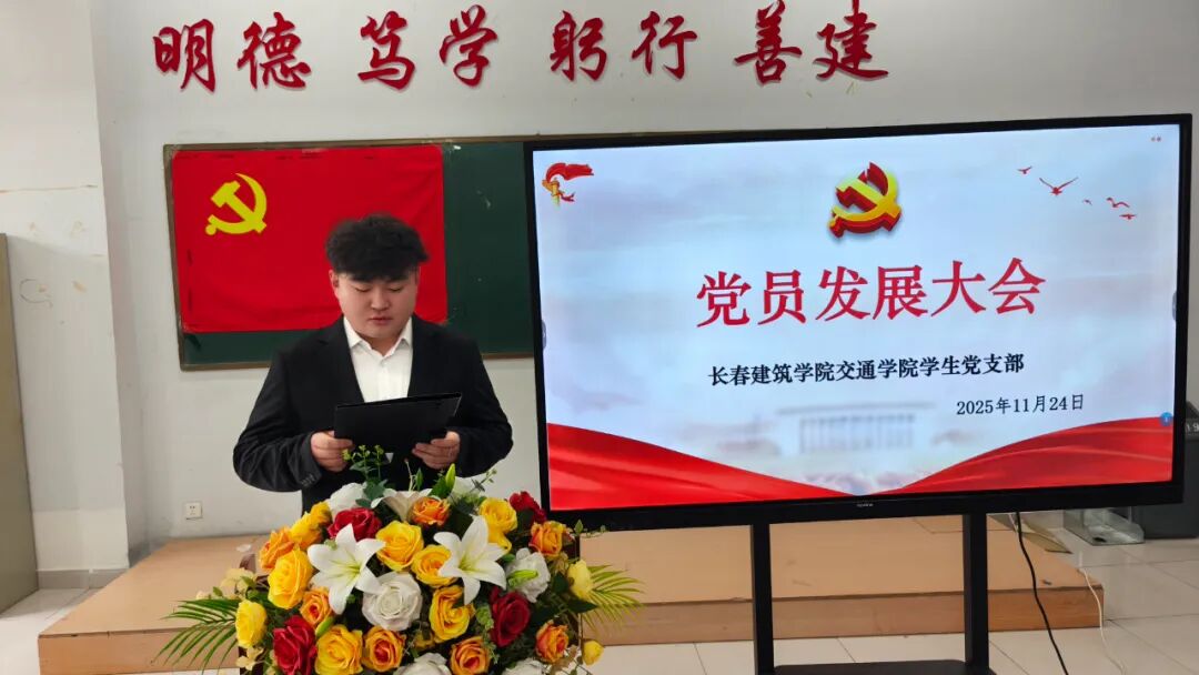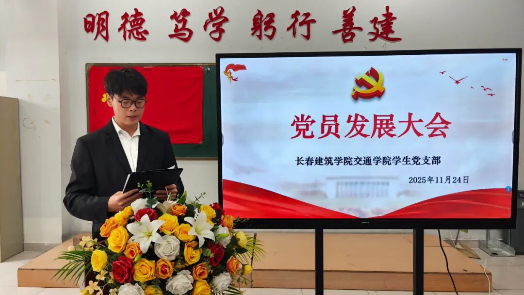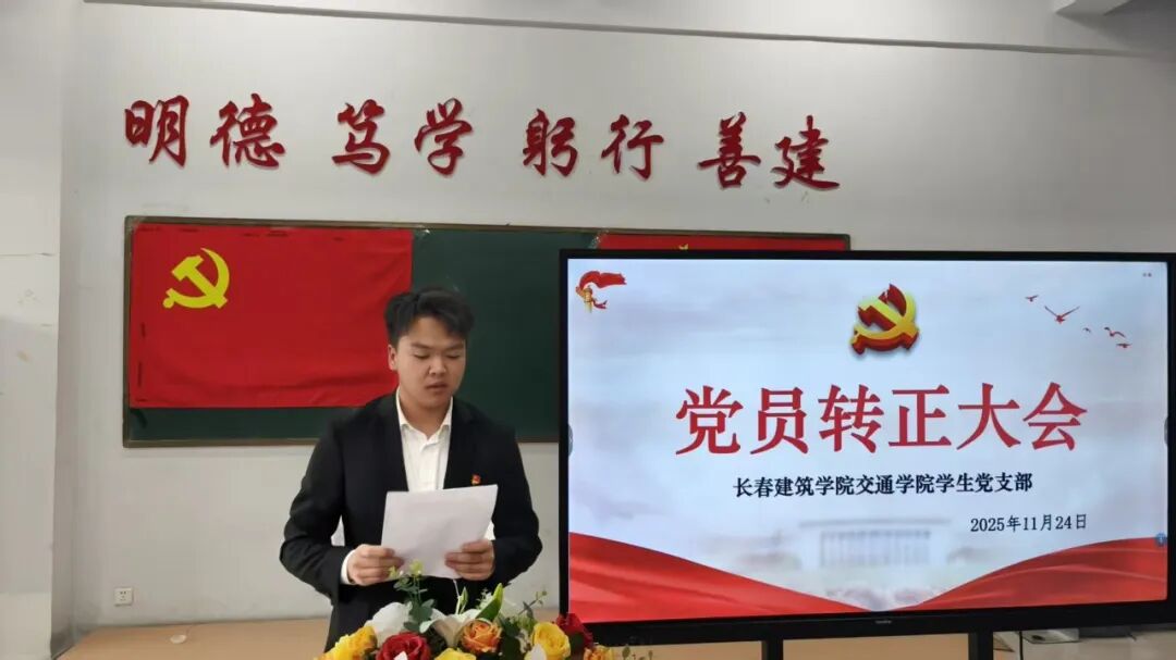 2025年11月24日,长春建筑学院交通学院在党团活动室召开党员发展暨转正大会,主要审议、讨论并表决发展马金峰、宋锦阳、孙琳皓、许皓杰、吴焱博、陈泓硕、苗壮、贾紫琪、甄子轩九名同志为中共预备党员以及预备党员李明阳、赵守奇、徐启博三名同志转为中共正式党员事宜。参与本次大会的有:交通学院党总支副书记马琰、教工支部书记李国栋以及全体党员。本次会议由交通学院学生支部书记郭梓睿主持。会议伊始,郭梓睿报告:长春建筑学院交通学院党总支共有党员27人,应到会正式党员18人,实到会正式党员18人,到会有表决权的正式党员超过一半,符合组织规定,可以开会。