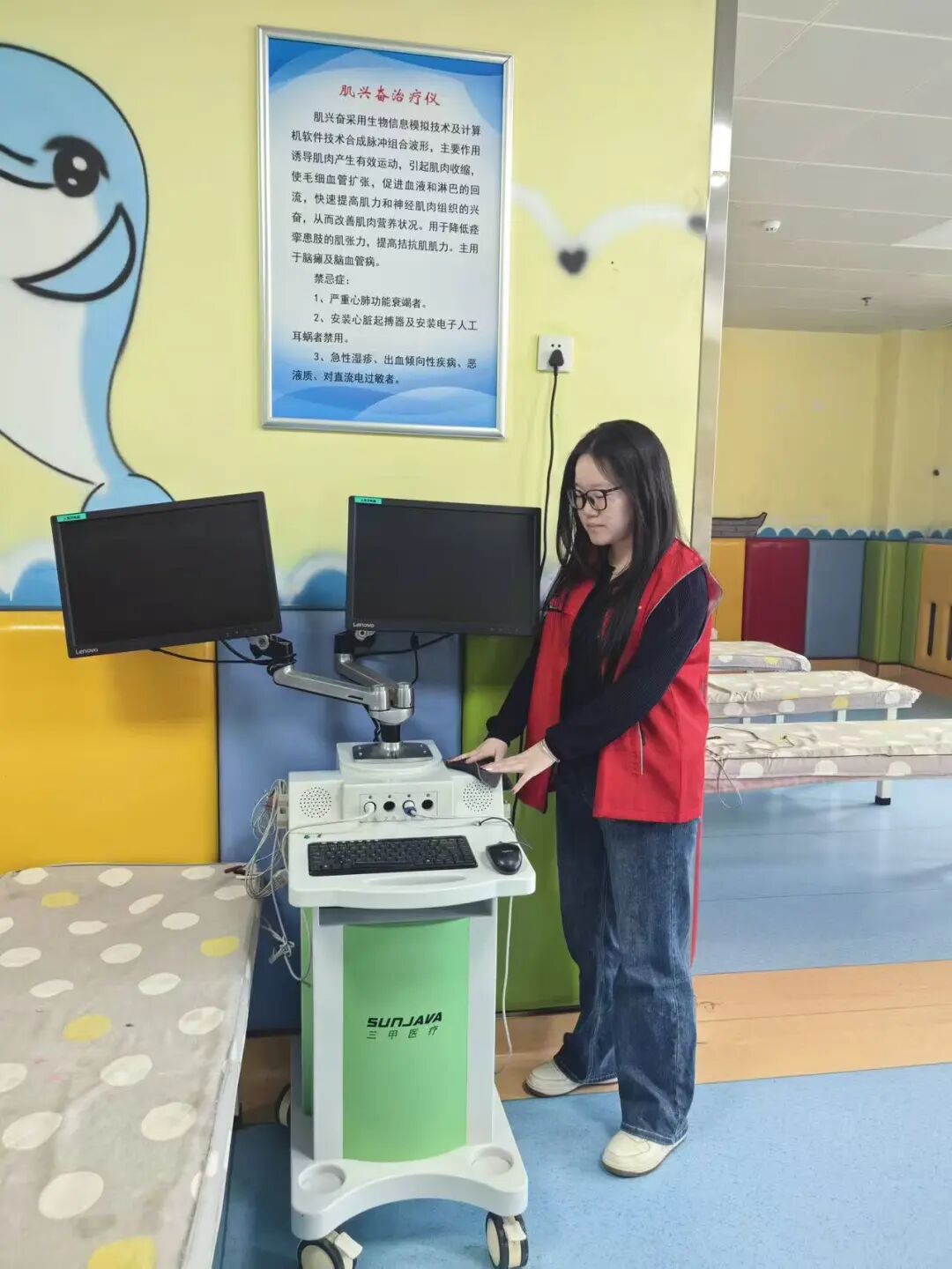 在这个假期,孔瑞慈来到了曲阜市第二人民医院儿童康复中心开展社会实践。孔瑞慈的核心工作是做好环境卫生维护、物品整理归纳以及康复仪器清洁消毒,用最朴素、最踏实的劳动,为在这里接受康复治疗的孩子们、辛勤付出的医护人员以及悉心陪伴的家长们,营造一个干净、整洁、安全且温馨舒适的康复环境,用微小的行动为这个充满爱与坚守的地方贡献自己的一份力量。